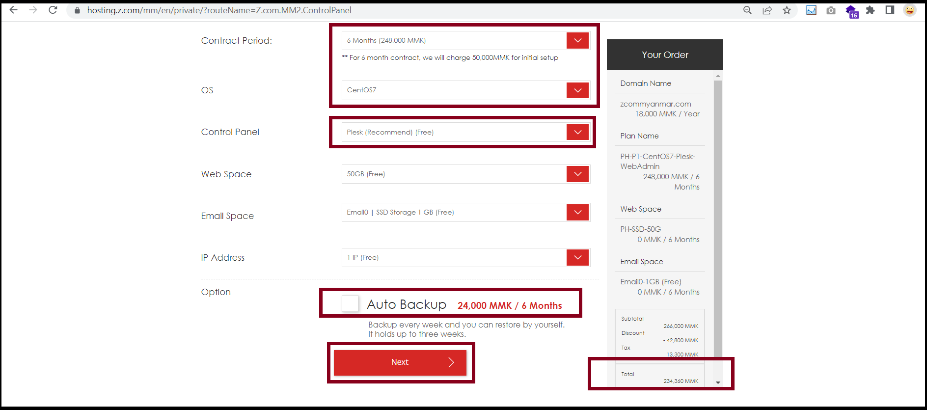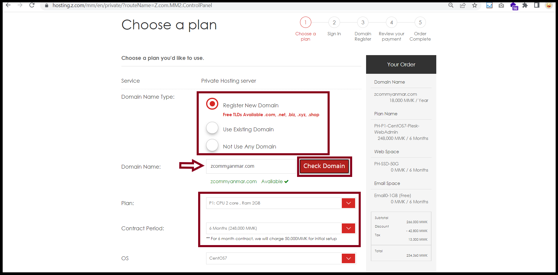 - Choose Plan, Contract Period, OS, and Control Panel