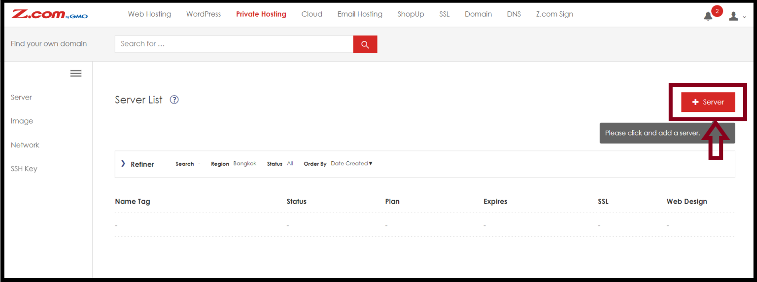 Step2. Go to the “Private Hosting” Tab. And Click “+Server“.