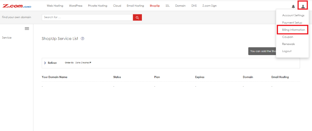 Step (2). After successfully logging into your Z.com account, please click on the person icon on the top right-hand side and select “Billing Information”.