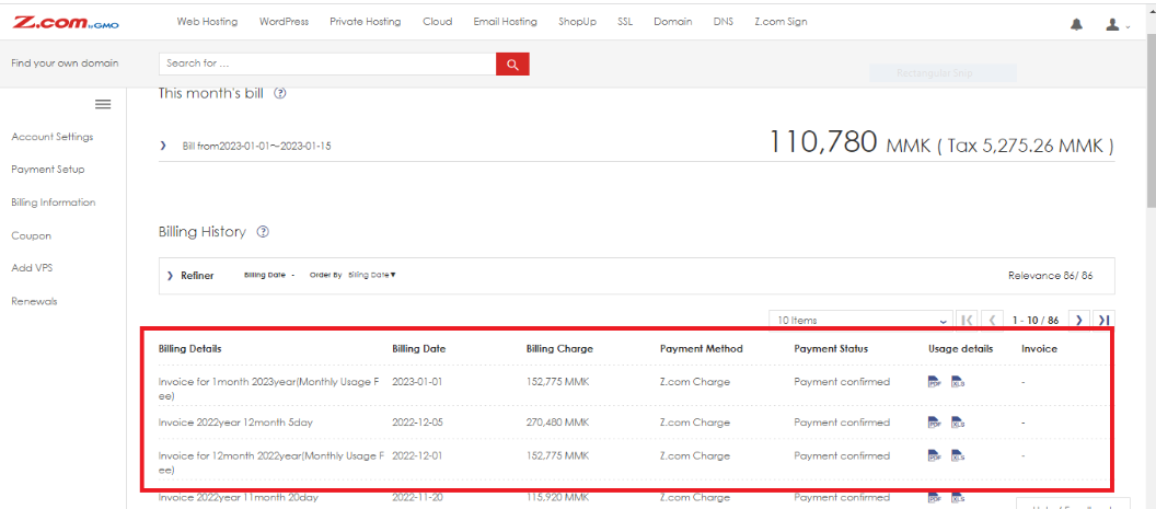 Step (3). You can view all bill details for your service. You can download PDF and XLS files that have been used with the Z.com service as shown in the picture.