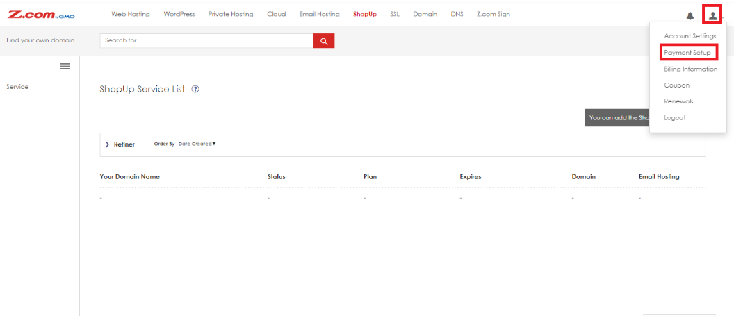 Step (2). After successfully logging into your Z.com account, please click on the person icon on the top right-hand side and select “Payment Setup”.