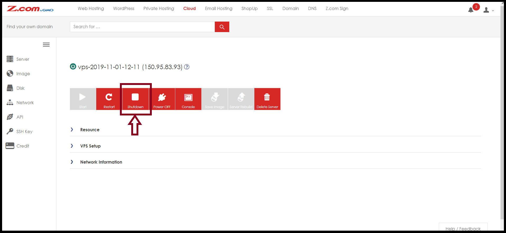 Step(3)- To do the Save Image of the Private Hosting Server, Please “Shutdown“ the Server first.