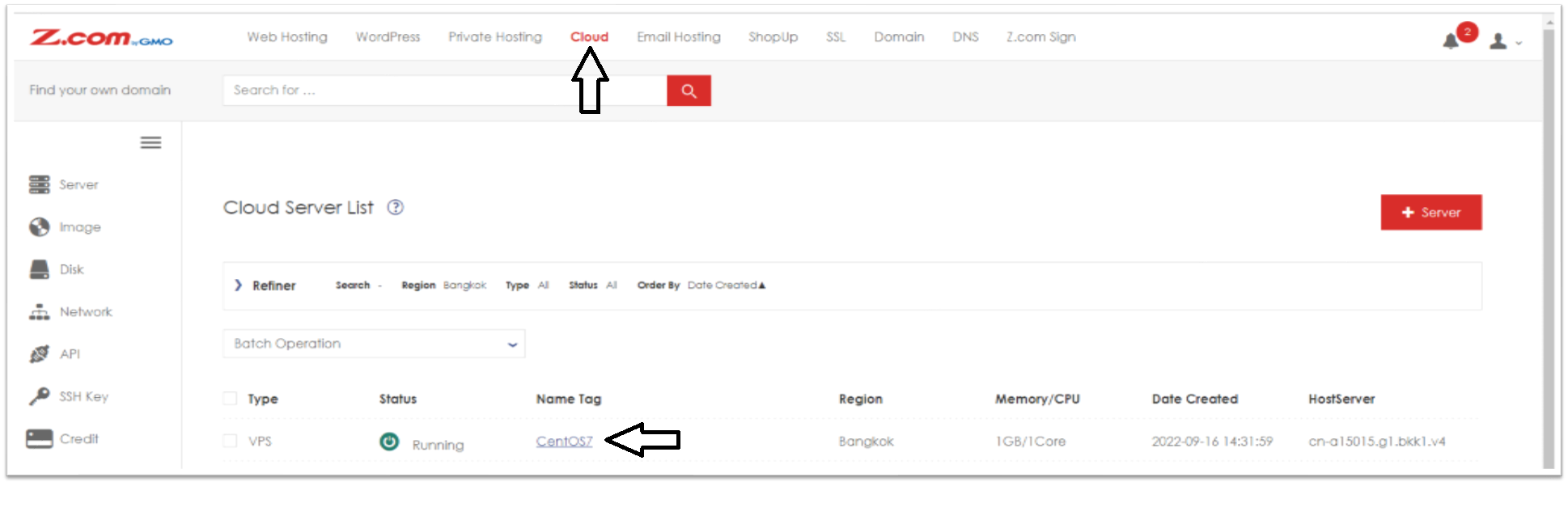 Step1. After login to My Z.com, please go to the “Cloud” menu and click on “the server name tag” to access the VM console.