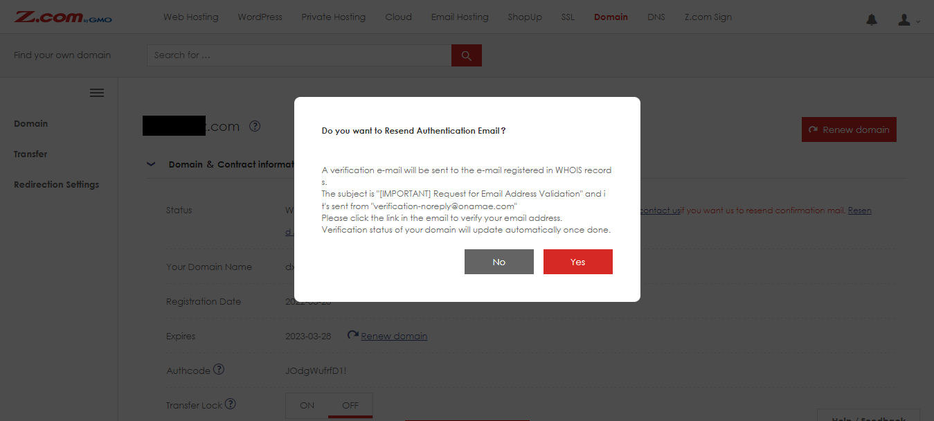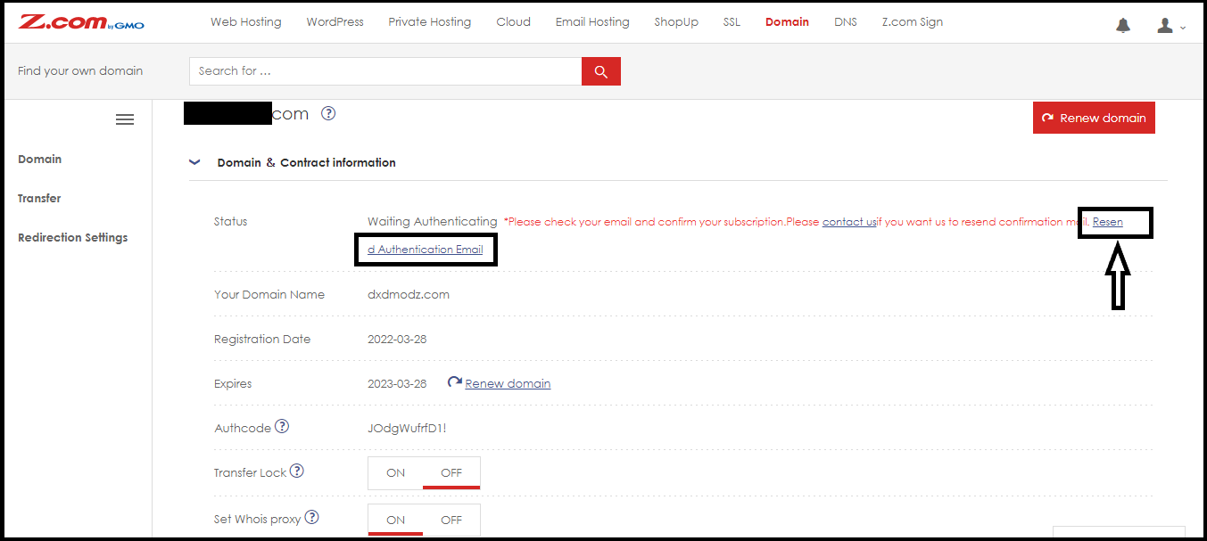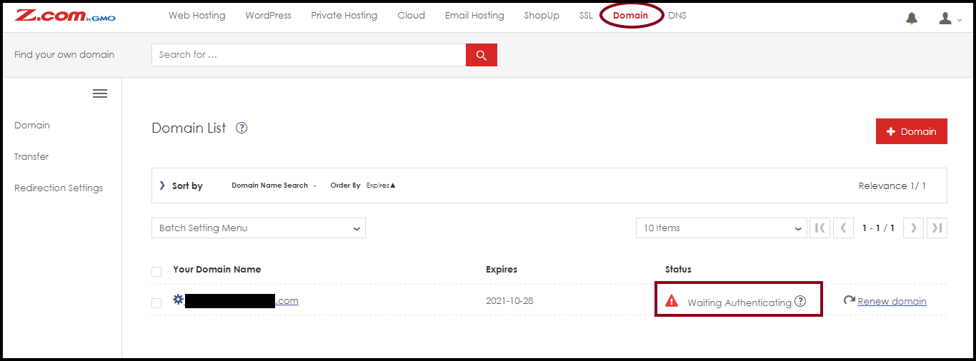 For new domain, you need to confirm the domain’s ownership by clicking the URL in your email address. If you haven’t confirmed it yet, the domain’s status is "Waiting Authenticating".