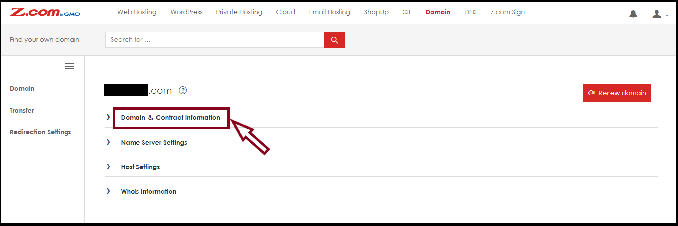 Step3. Click your domain name and Expand "Domain & Contract Information".