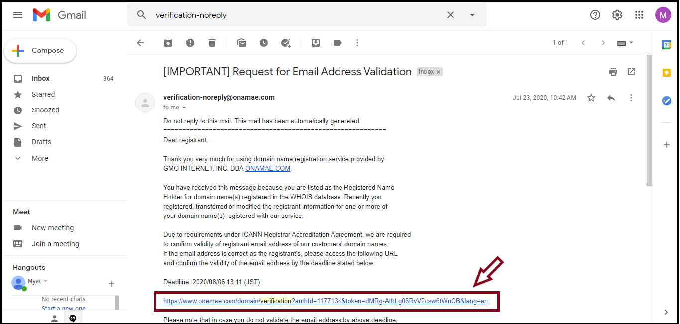 The subject is "[IMPORTANT] Request for Email Address Validation" and it's sent from "verification-noreply@onamae.com"