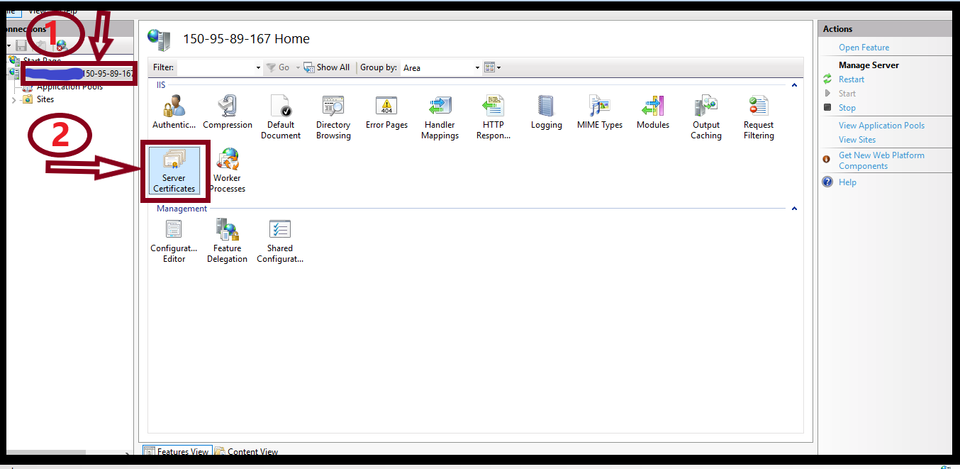 Step(2) Select Server on the left side of the window and click “Server Certificates”.