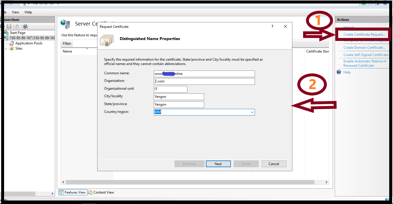 Step(3) Click “Create Certificate Request” on the right side of the window and the “Request Certificate” box will be opened. Fill out the “Distinguished Name Properties” form with the following instruction.