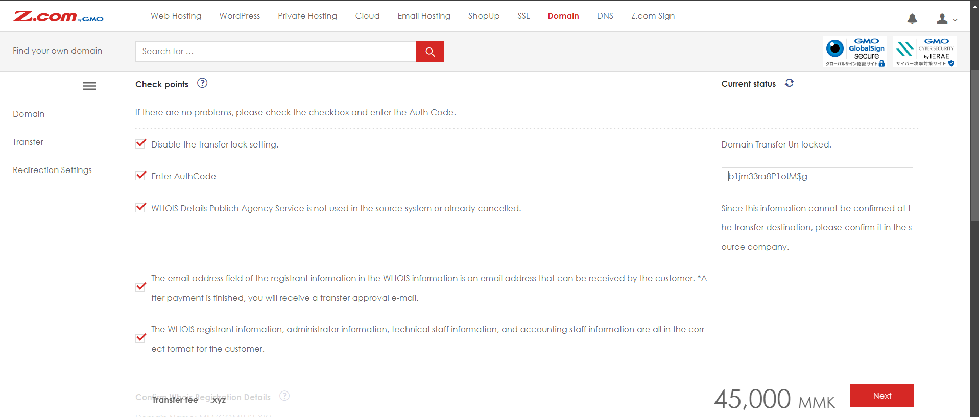 - In Enter Auth Code, please fill the Auth Code/ EPP Code