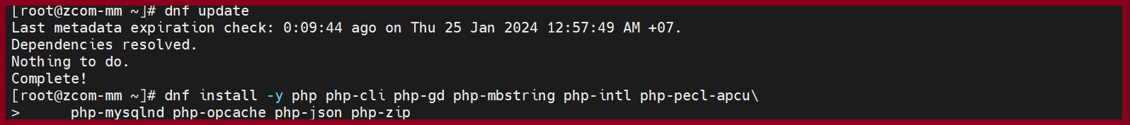 [root@zcom-mm ~] # dnf install -y php php-cli php-gd php-mbstring php-intl php-pecl-apcu\ php-mysqlnd php-opcache php-json php-zip