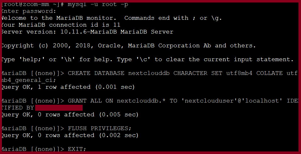 MariaDB [(none)]> GRANT ALL ON nextclouddb.* TO 'nextclouduser'@'localhost' IDENTIFIED BY 'change-with-strong-password';