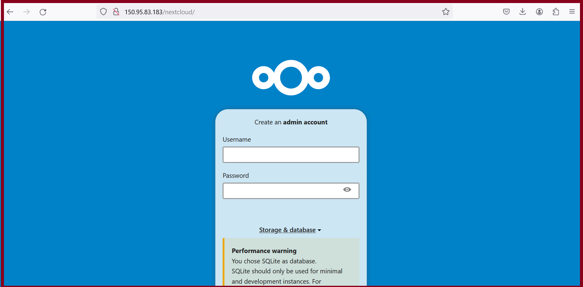 Open up your web browser, can access the nextcloud with ip (or) domainhttp://150.95.**.***/nextcloud/