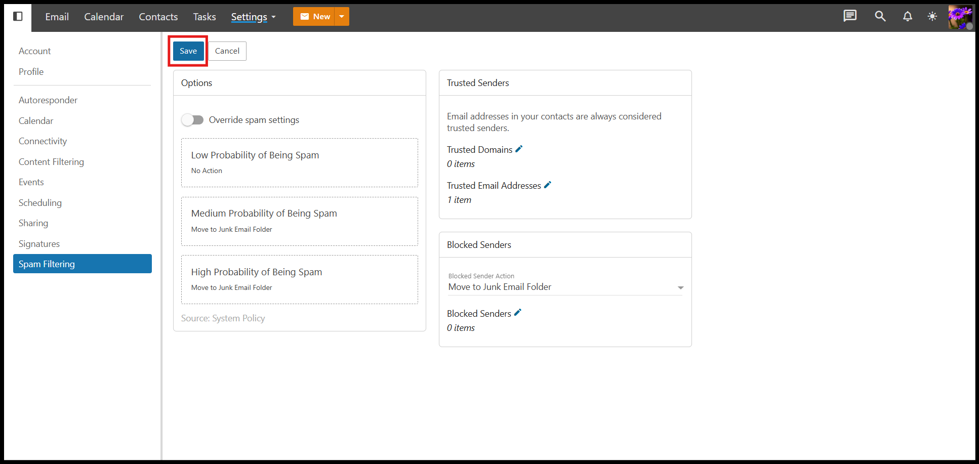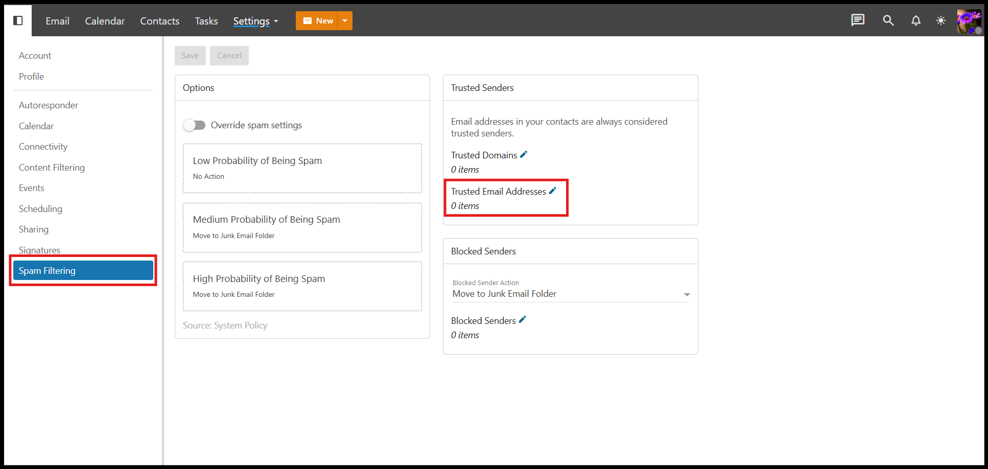 5. Click on the Spam filtering and then click on the Pencil icon by the Trusted Email Addresses.