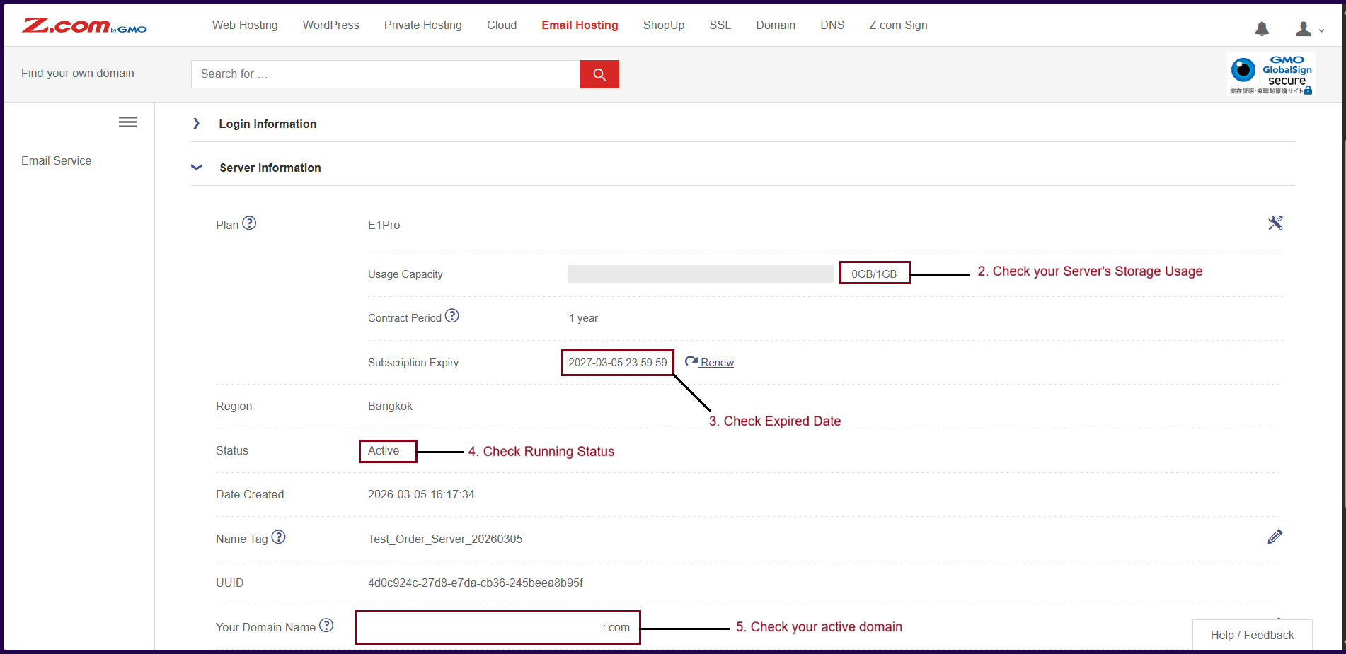 And you can also check your Server information such as Plan, Usage Capacity, Expiry, Status and Active domain on email hosting.