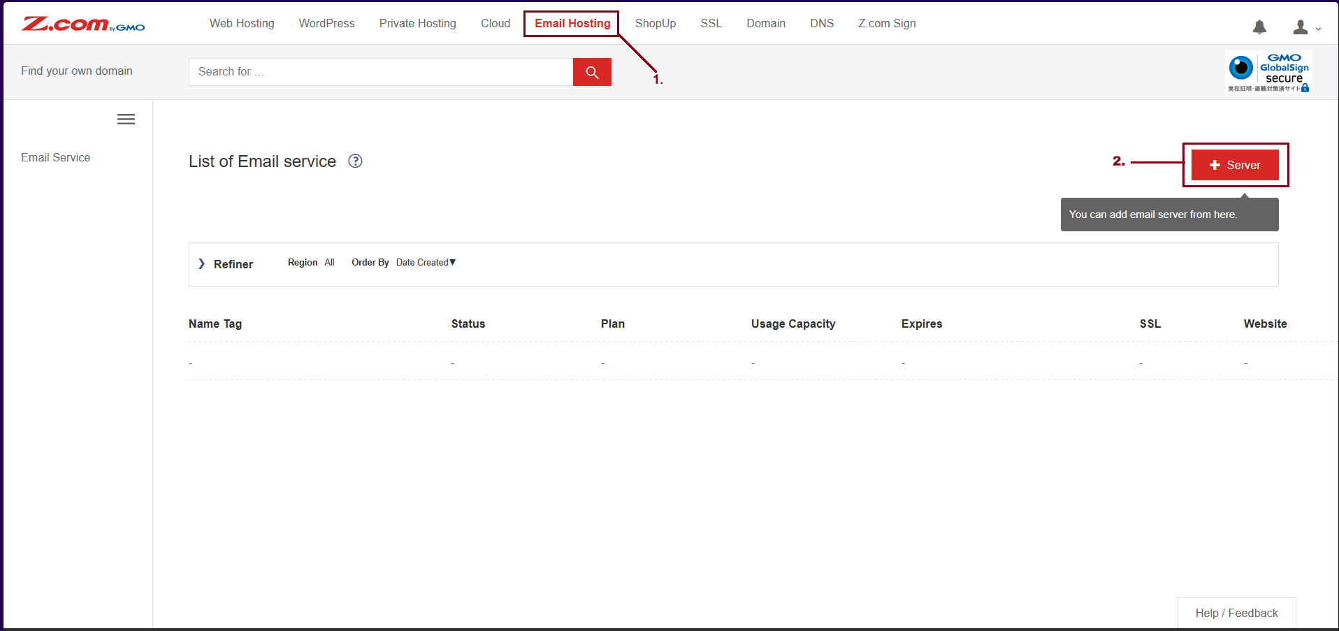 Click “Email Hosting” and click “+Server” as follows