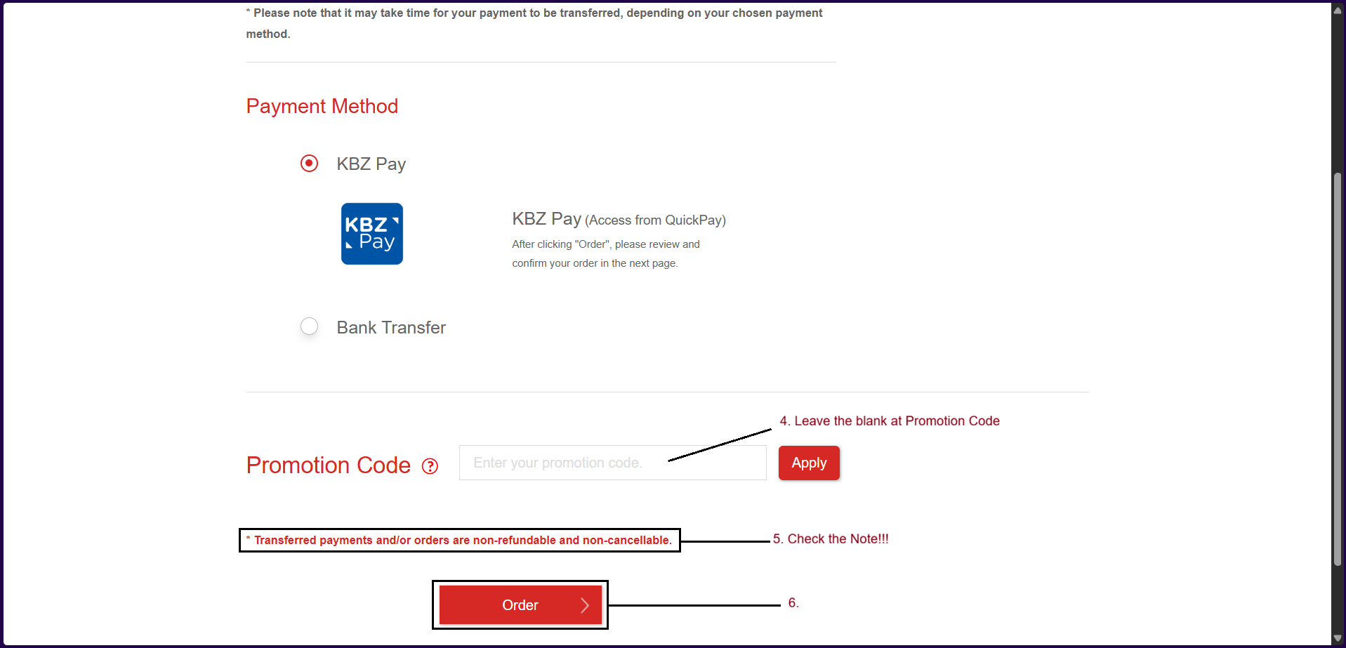 For Bank Transfer, you can make the payment with the following and can also pay with Kpay(QuickPay). To Check "Payment Method", click here.