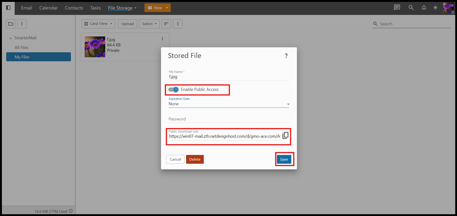 The Public download Link can be copied and can share with the email as public access. Click “Save“