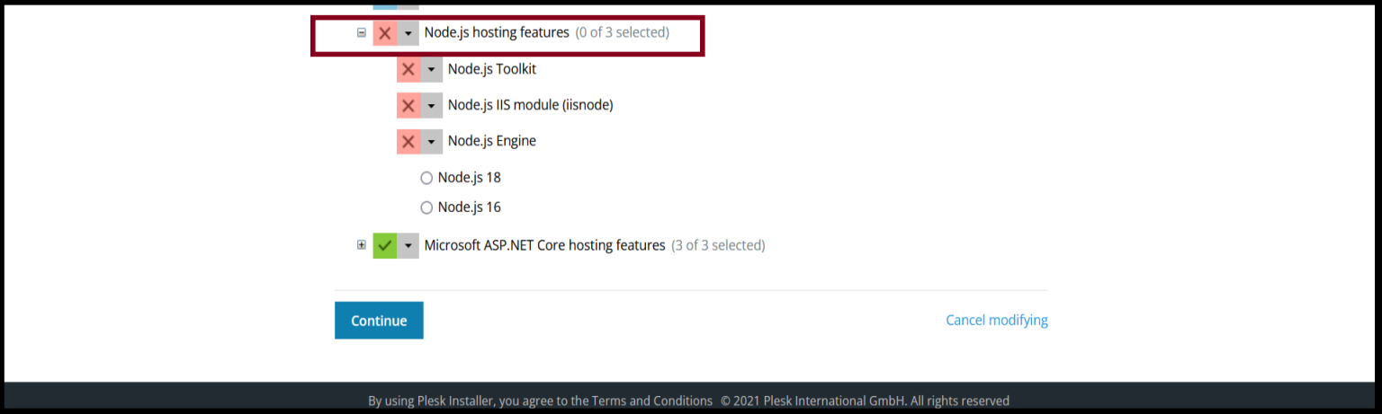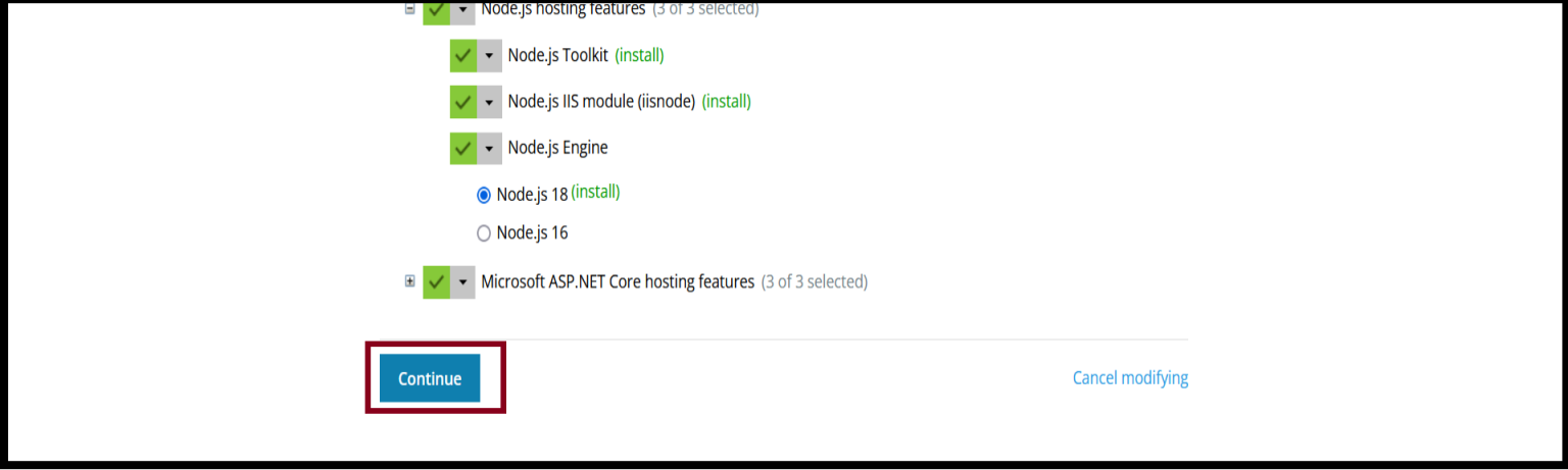 Select the Node.js hosting features and Choose the Node.js Version that you want to install.