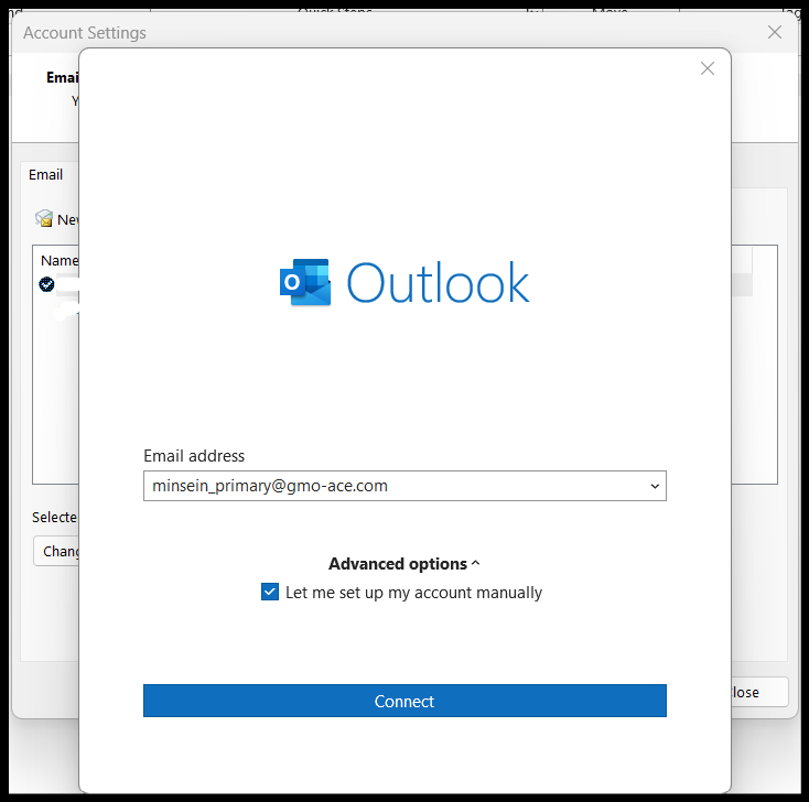 Next, add email address and click "Advanced options" to select "Let me set up my account manually" and click "Connect"