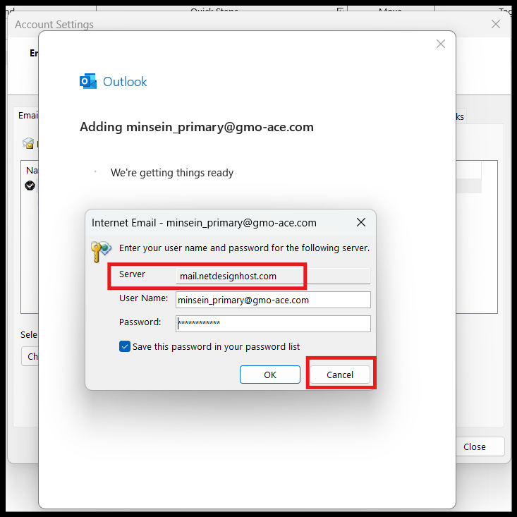 If the server is showing mail.netdesignhost.com, click "Cancel" to change server address.