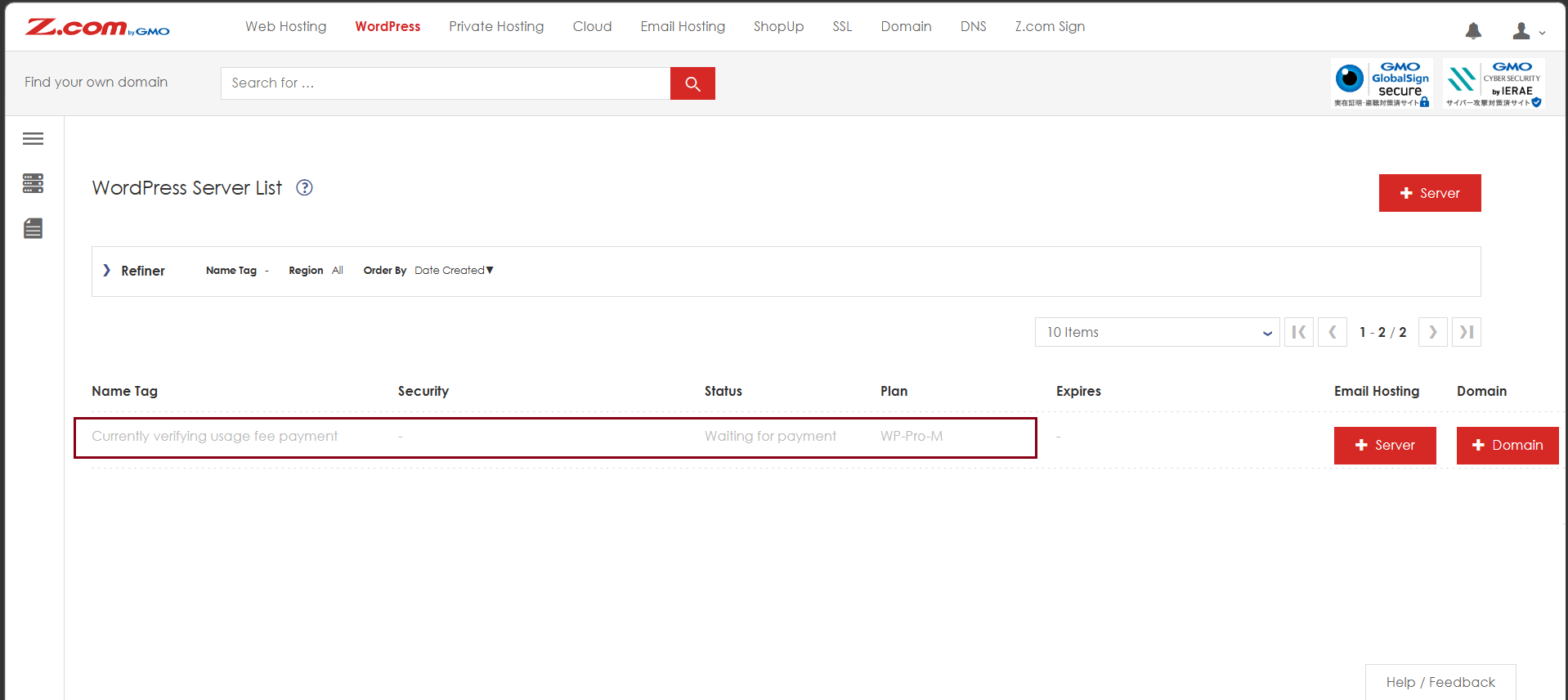 Step2. Click your "WordPress Pro Server" Under Name Tag