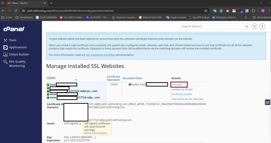 Step5: Click "Uninstall" the expired SSL and Self-signed SSL.