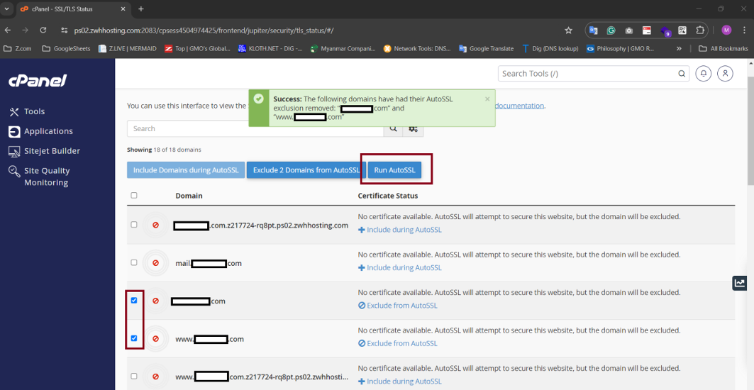 Step8: Select all Checkbox and Click "Exclude Domain from AutoSSL".