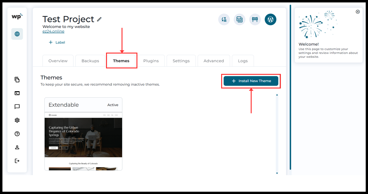 6. Domain details page will be opened. Click “Themes” and then click “Install New Theme”.