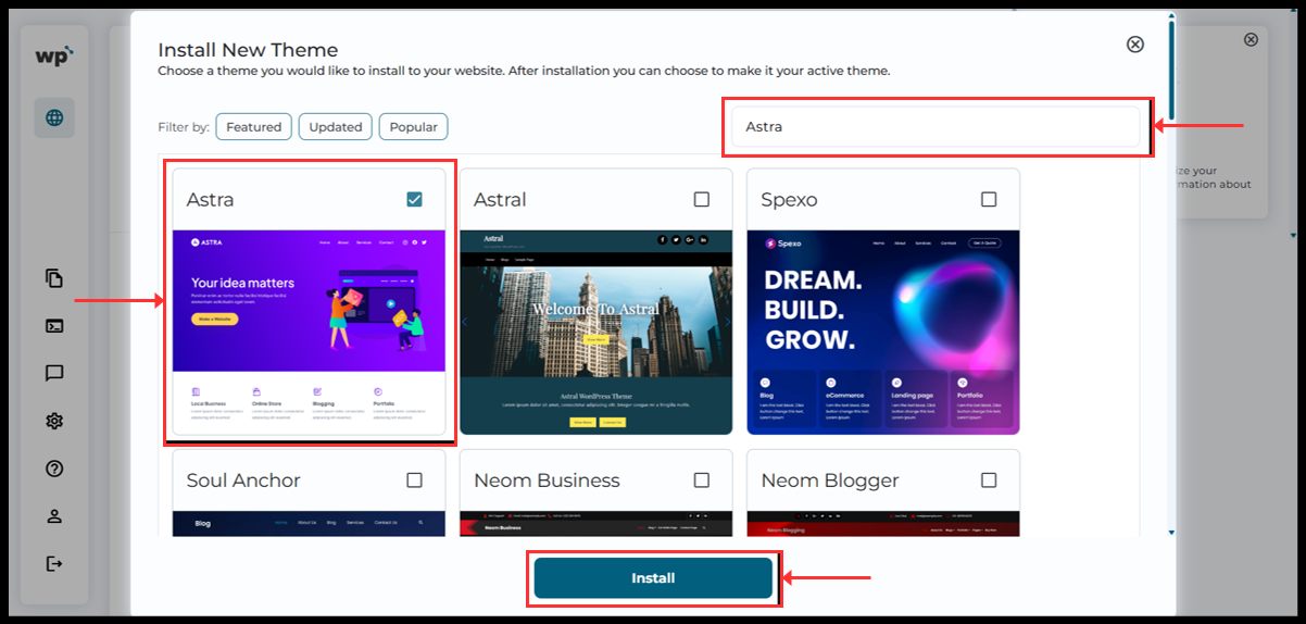 7. A popup window will be opened. Type your prefer theme name in the Search box and then select the theme and click “Install”. After installation complete, close the popup window.