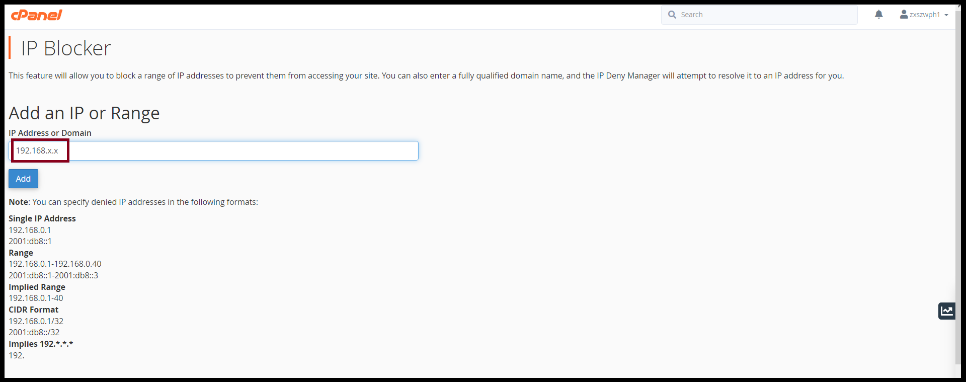 Step6. Please enter IP (or) domain that you want to block from cPanel.
