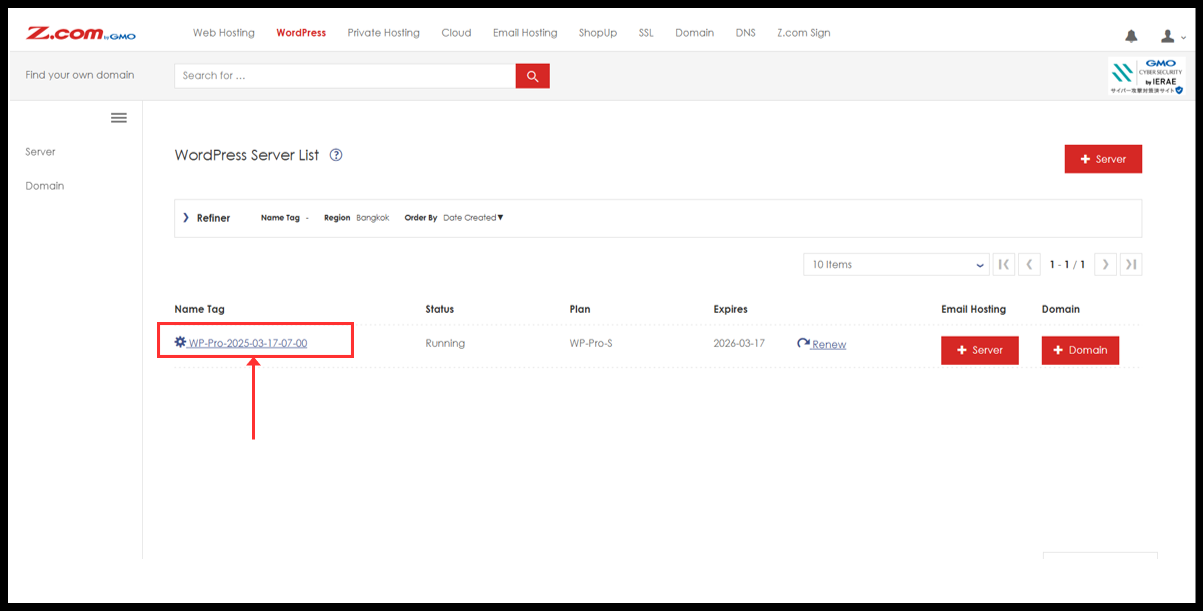 3. You will see the WordPress server under Name Tag. Please click it.