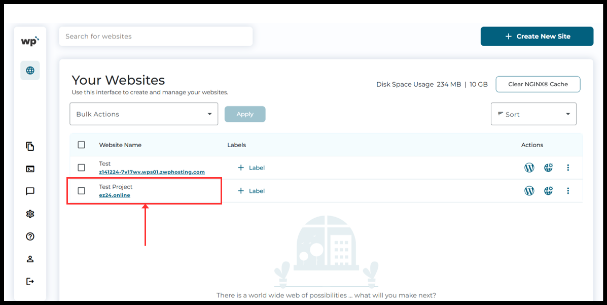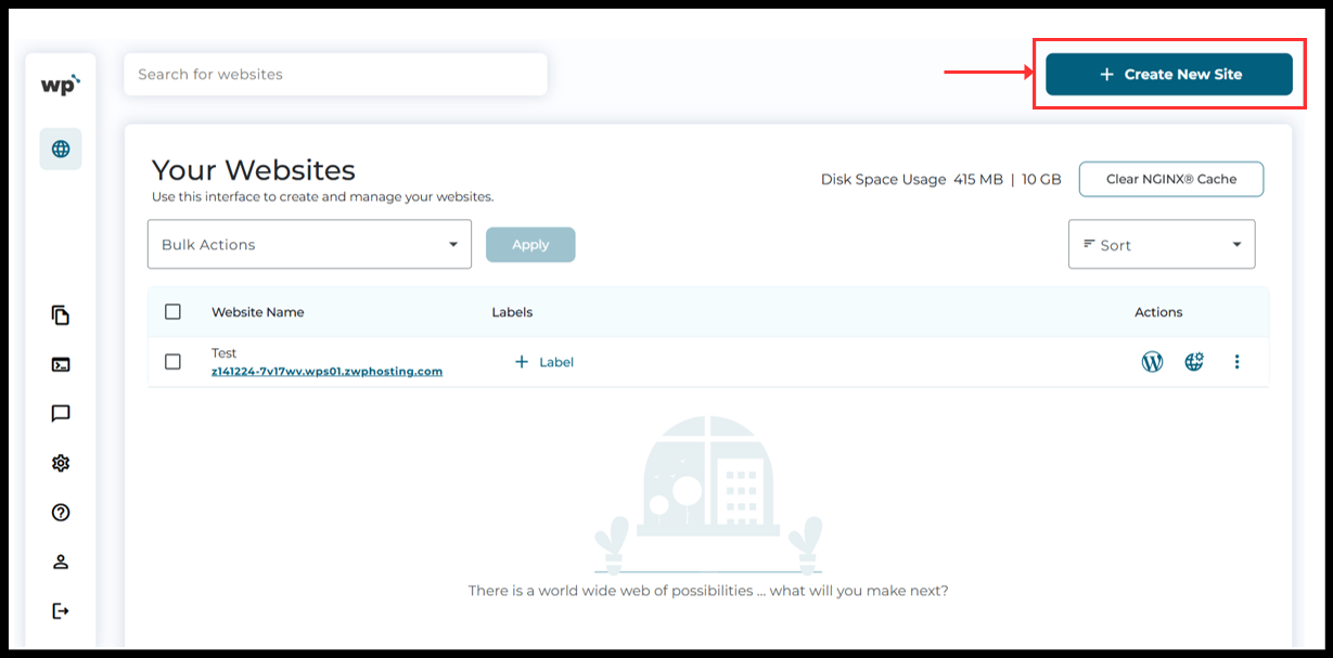 5. Now, the WordPress Squared Panel will see and click on the "Create New Site" botton to add the domain.