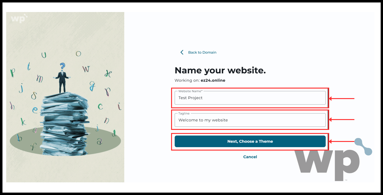 7. Fill the website name and Tagline as you prefer. Then click “Next, Choose a Theme”.