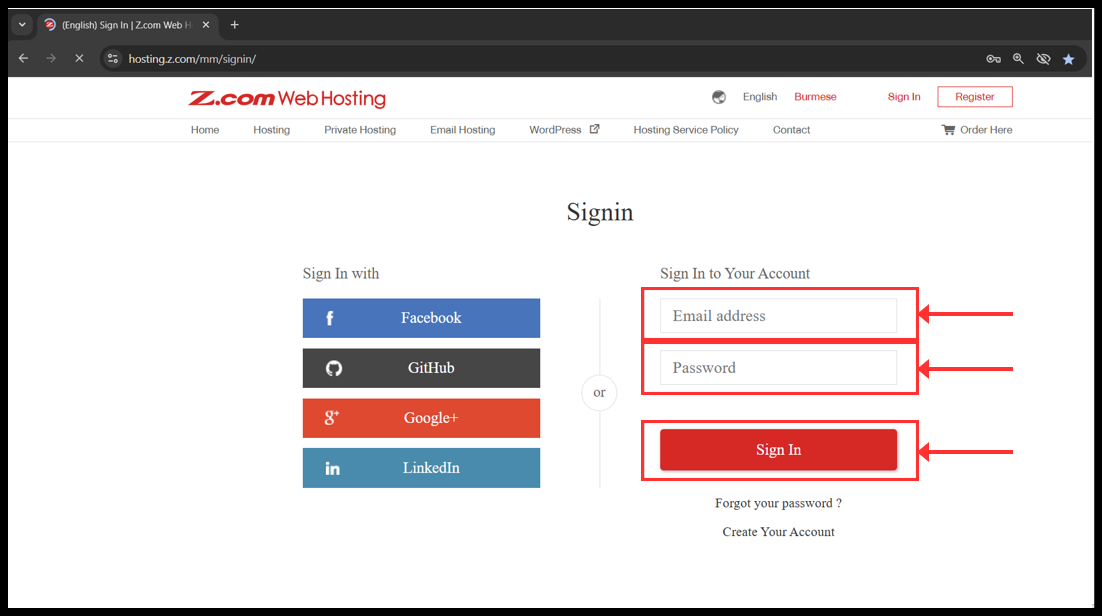 ၁။ သင်၏ အီးမေးလ်လိပ်စာကို အသုံးပြုပြီး သင့်၏ Z.com အကောင့်သို့ ဝင်ရောက်ပါ။