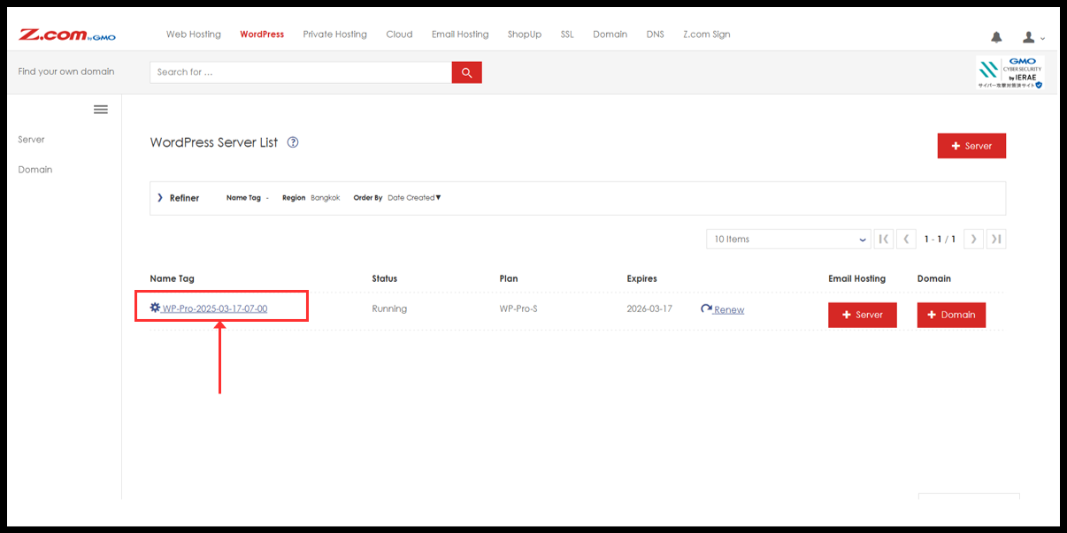 3. You will see the WordPress server under Name Tag. Please click it.