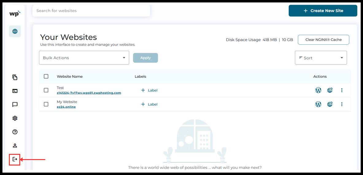 ၅။ ယခု WordPress Squared Panel ကို မြင်တွေ့ရပါလိမ့်မည်။ Panel မှ ထွက်ရန် ဘယ်ဘက်အောက်ခြမ်းတွင်ရှိသော “Log out” icon ကို နှိပ်ပါ။