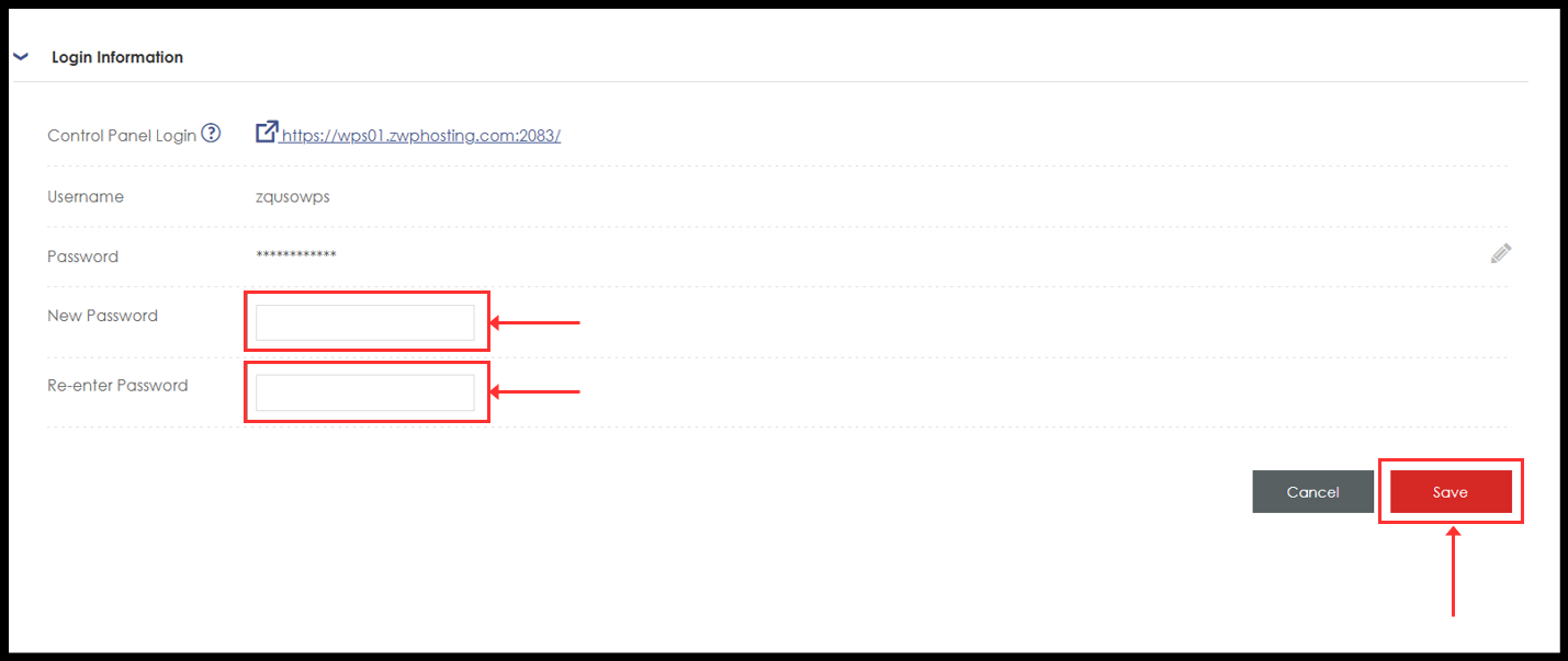 5. If you have clicked password edit button, it will ask for new password. Type the new password and click “Save”. After this, your password have been changed and can now log in to Wordpress Squared panel with new password. (No further steps are required to do)