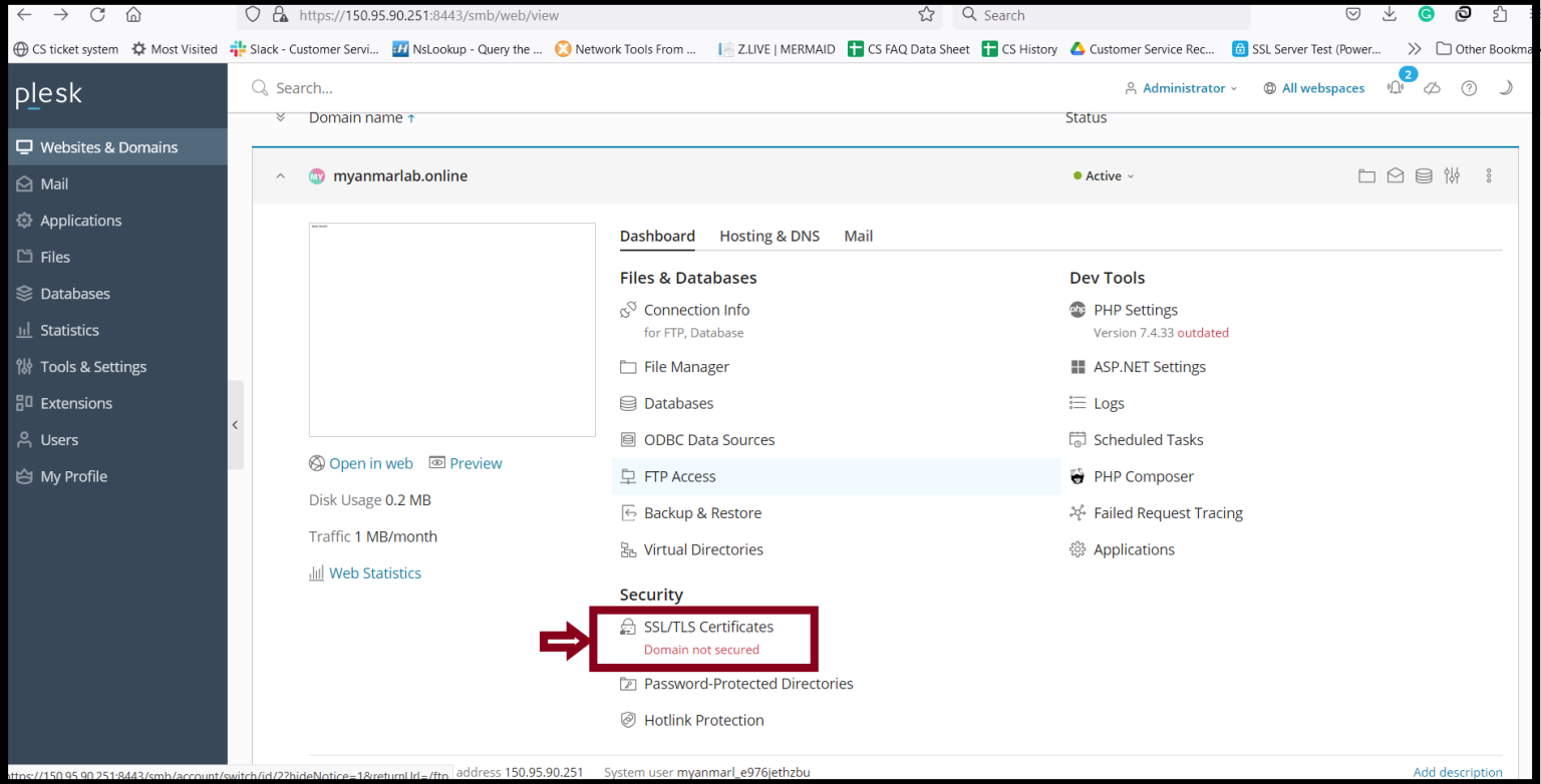 Step1. Login to the Plesk server with the admin account. Go to SSL/TLS Certificates under “Websites & Domains”.