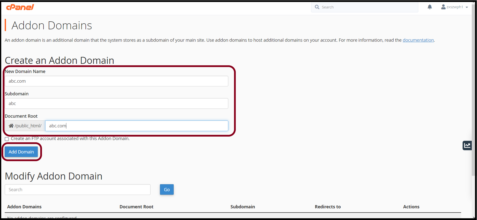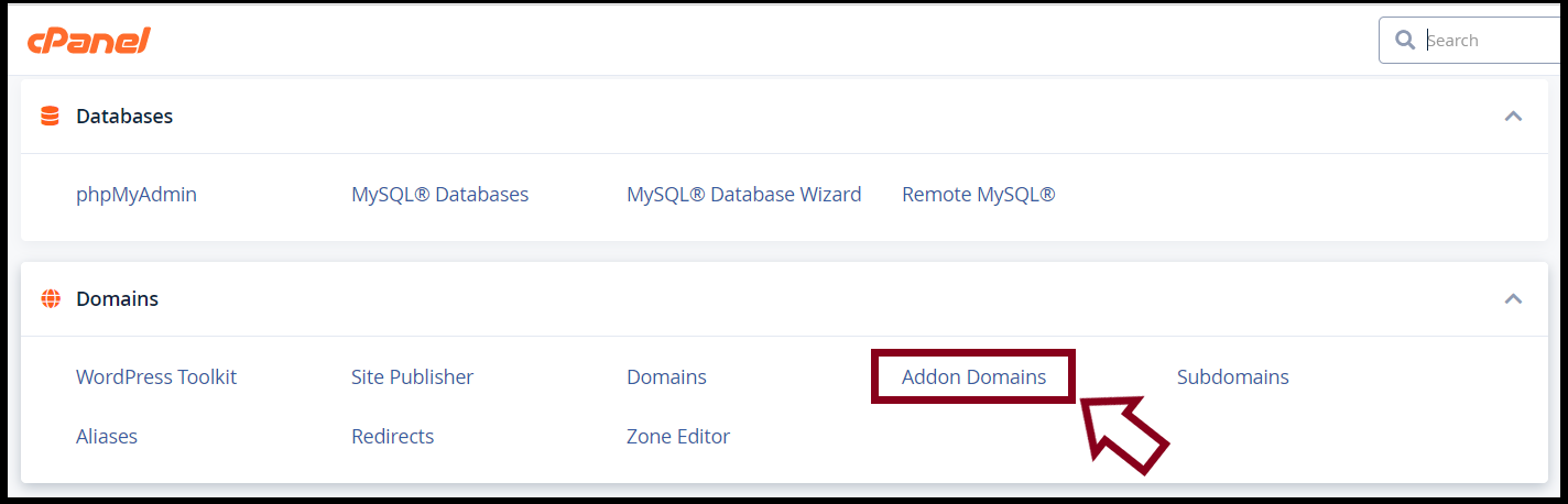 Step4. Please select “Addon Domains” under the “Domains” Menu on cPanel