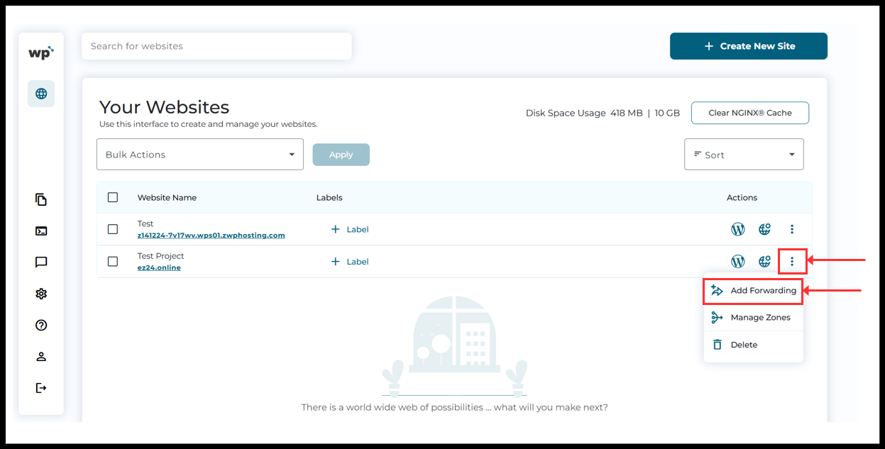 5. Now, the WordPress Squared Panel will see and click on the three dots from right side and then click “Add Forwarding”.
