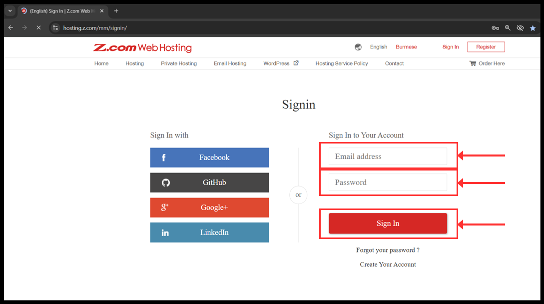 ၁။ သင်၏ အီးမေးလ်လိပ်စာကို အသုံးပြုပြီး သင့်၏ Z.com အကောင့်သို့ ဝင်ရောက်ပါ။