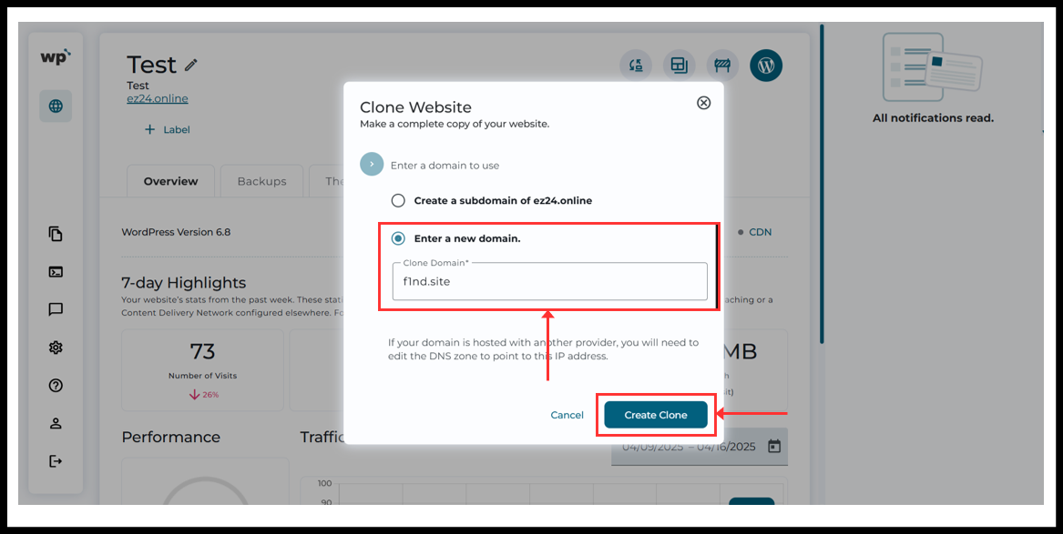 ၇။ Popup window တစ်ခု ပေါ်လာပါလိမ့်မည်။ လက်ရှိ domain ၏ subdomain ဖြင့် သို့မဟုတ် domain အသစ်ဖြင့် clone website ကို ဖန်တီးနိုင်ပါသည်။ Domain အမည်အသစ်ကို ထည့်သွင်းပြီး “Create Clone” ကို နှိပ်ပါ။ ထို့နောက် အချိန်အနည်းငယ် စောင့်ဆိုင်းပါ။ System မှ website ကို clone လုပ်ပြီးပြီးနောက် ပြီးဆုံးသွားသောအခါ WordPress Squared Panel စာမျက်နှာသို့ အလိုအလျောက် ပြန်သွားပါလိမ့်မည်။