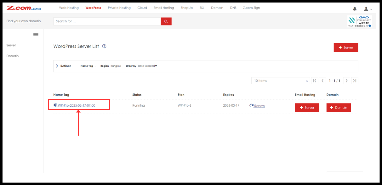 ၃။ Nametag အောက်မှာ WordPress ဆာဗာကိုတွေ့ပါမည်။ ကလစ်နှိပ်ပြီးဆက်သွားပါ။