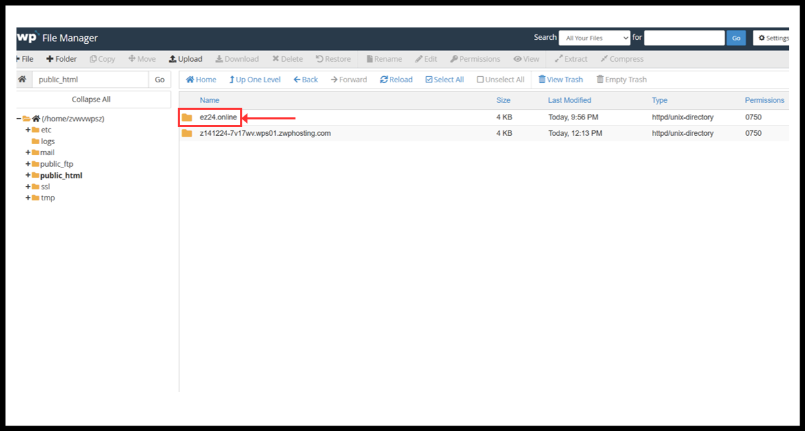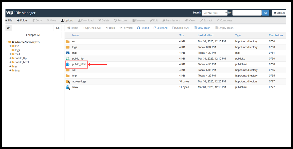 6. Now the file manager page will open. To manage website files, click “public_html”.