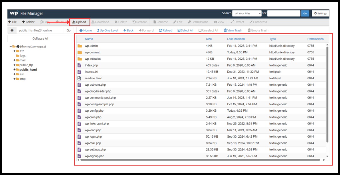 8. Here you will see the website files. If you wish to upload new files, click “Upload” button from the menu bar.