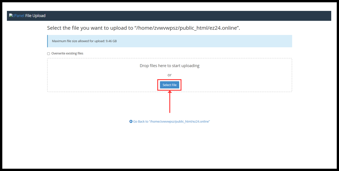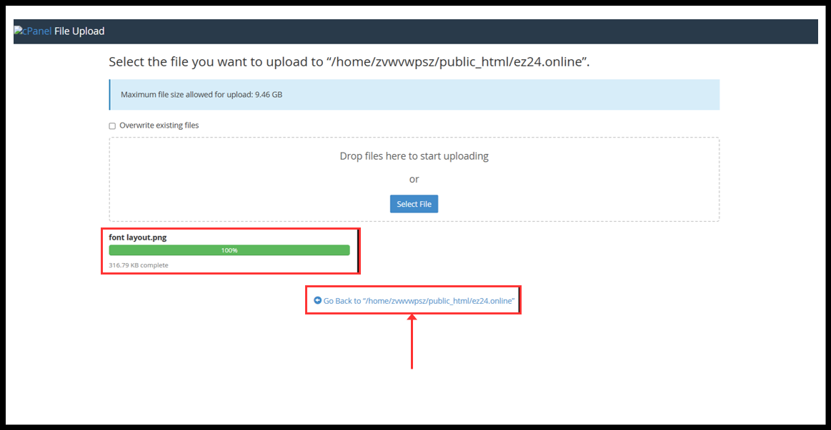 ၁၀။ Upload လုပ်ခြင်း ၁၀၀% ပြီးဆုံးသွားပါက progress bar သည် အစိမ်းရောင်အဖြစ် ပြောင်းလဲသွားပါလိမ့်မည်။ ထို့နောက် “Go Back” ခလုတ်ကို နှိပ်ပါ။ ထိုအခါ File Upload စာမျက်နှာကို ပိတ်ပြီး File Manager စာမျက်နှာသို့ ပြန်လည်သွားရောက်ပါလိမ့်မည်။