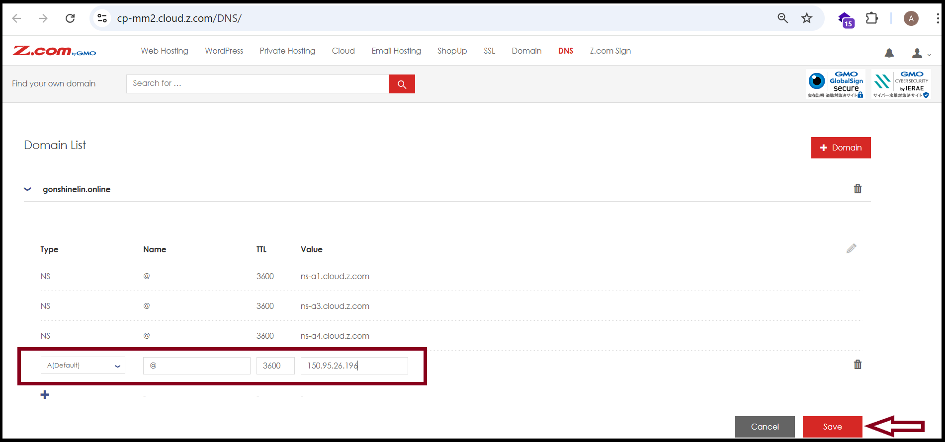 Step3. After the domain add-on process is finished, please login your Domain Provider Account to point the Server IP. Then add Private hosting server IP. IP will be different base on server. Click “Save”.