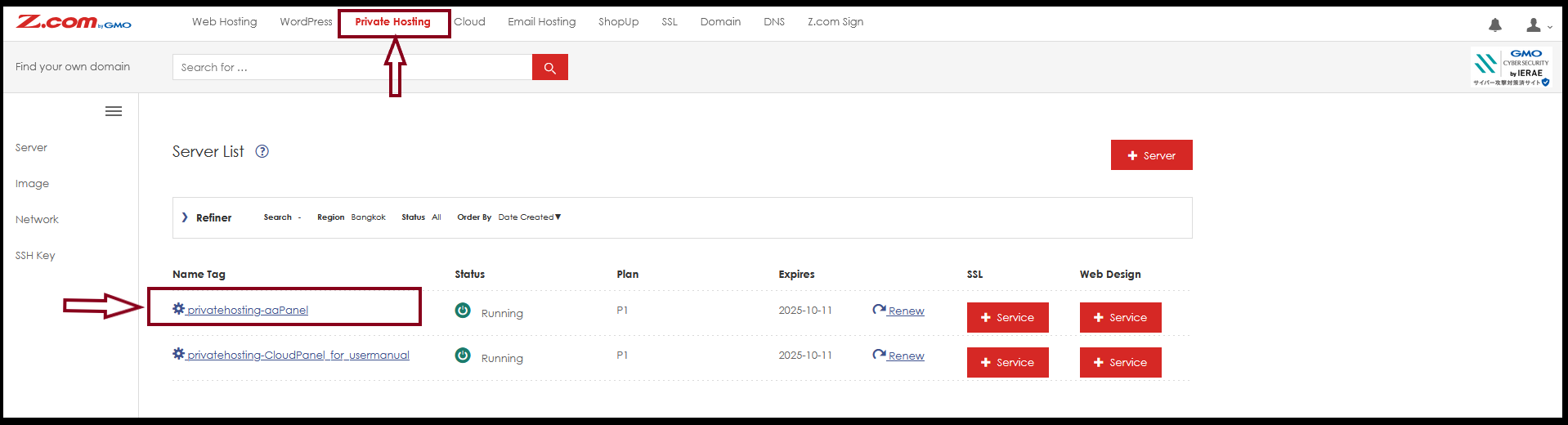 Step2. Go to “Private Hosting” Tab then Click the server Under Name Tag.