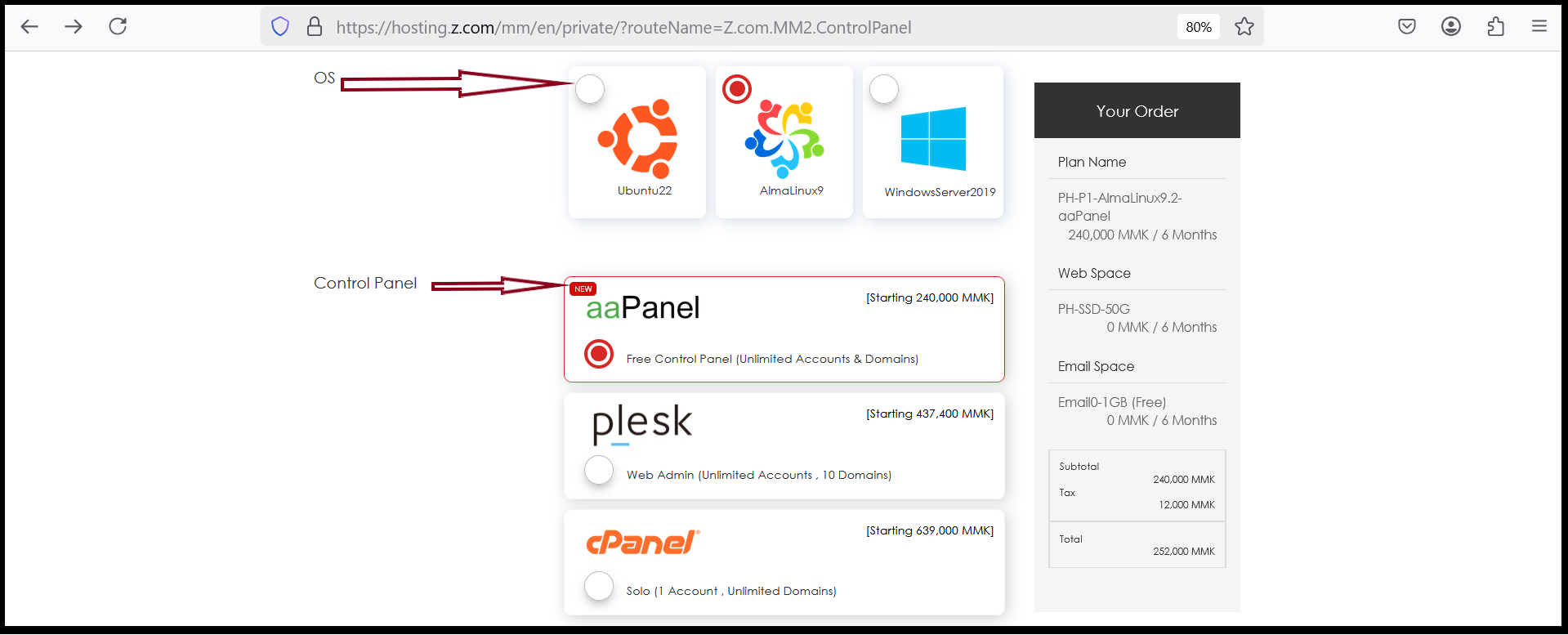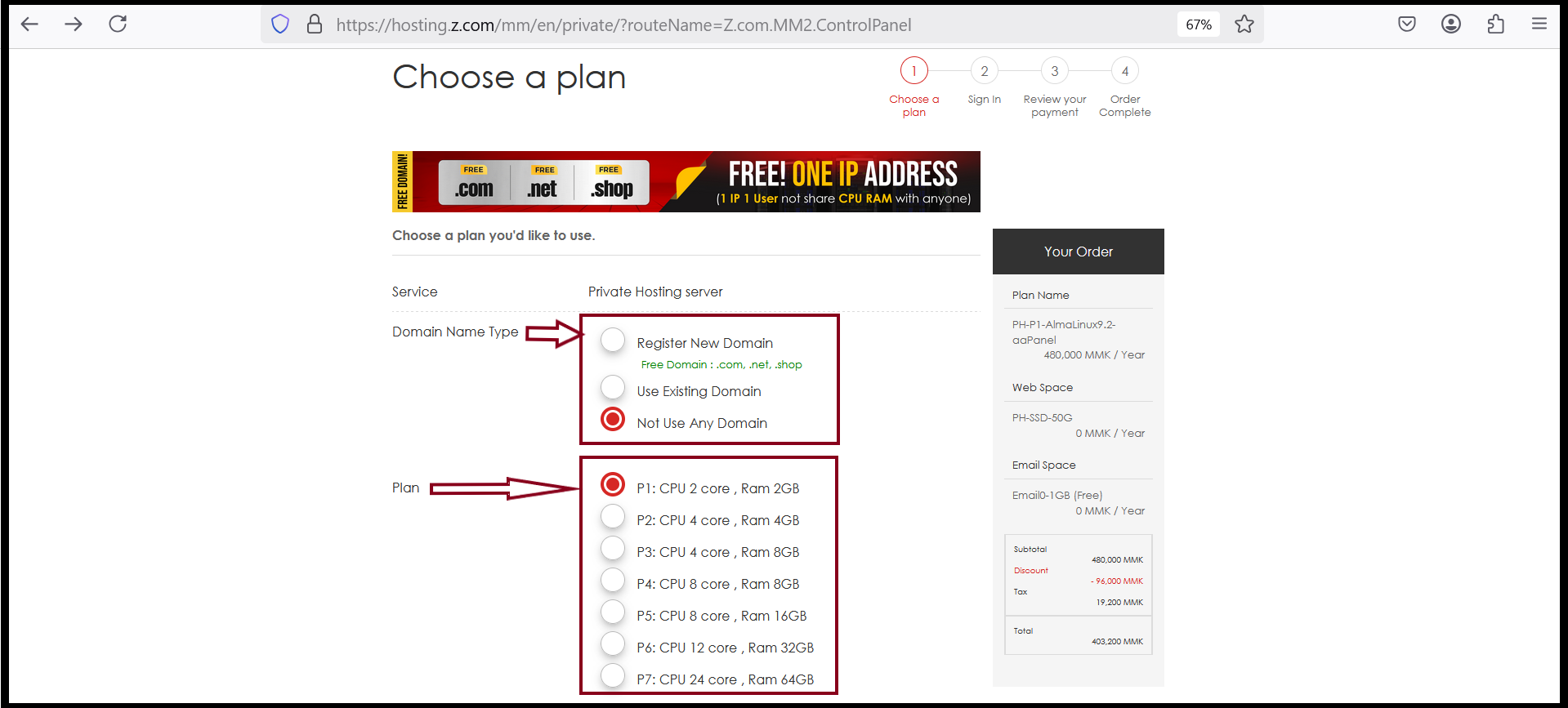 In this section, you need to choose “Domain Name Type”,”Plan package”, OS and Control Panel that you would like to use for your requirement.