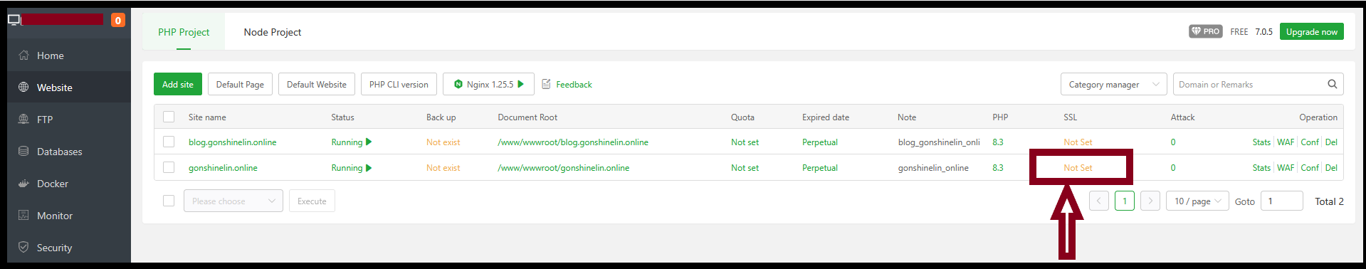 Step2. Click Not set to go to the SSL page of the domain you want to install.